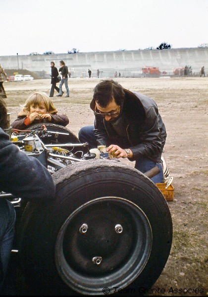 Jean-Claude et Yves ( Chatoune pour les intimes ) fignolent les réglages de la MEP. A cette époque ils travaillent tous les deux chez Citroën. L'un aux essais des prototypes de l'usine et autres nouveautés technologiques et l'autre dans le secteur des freins. Il m'apportent une aide précieuse moi qui suis néophyte en la matière! Accroché à la roue de la monoplace Olivier suit attentivement ses premiers cours de mécanique. La tradition perdure dans la famille car Noé ,mon petit fils, est actuellement en formation au Mans à la FFSA Academy comme mécanicien de véhicules historiques de compétition. L'aventure continue...